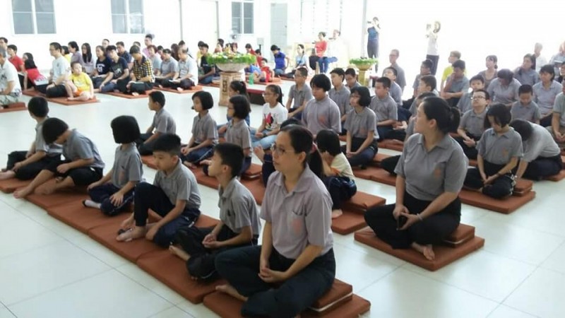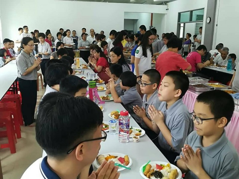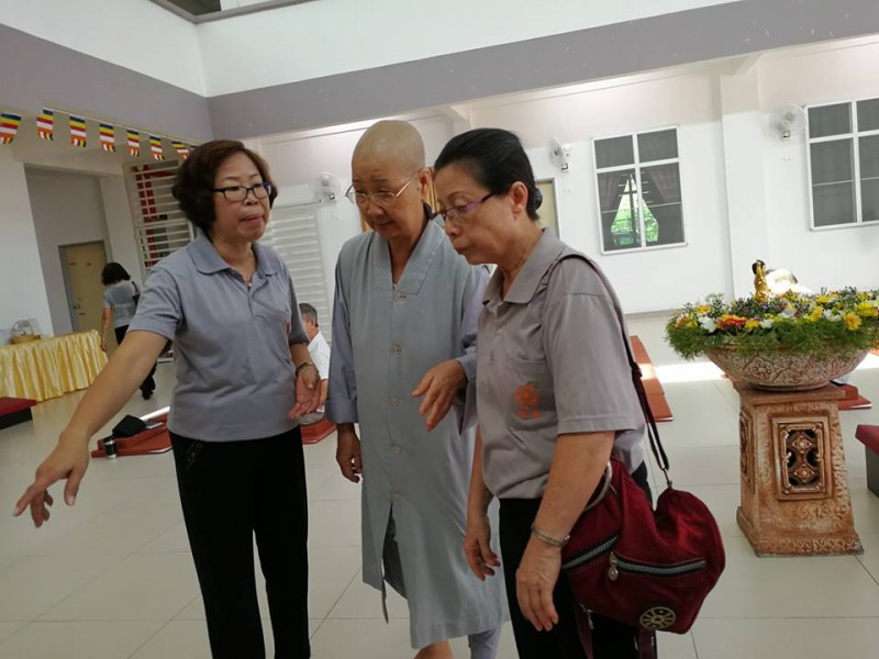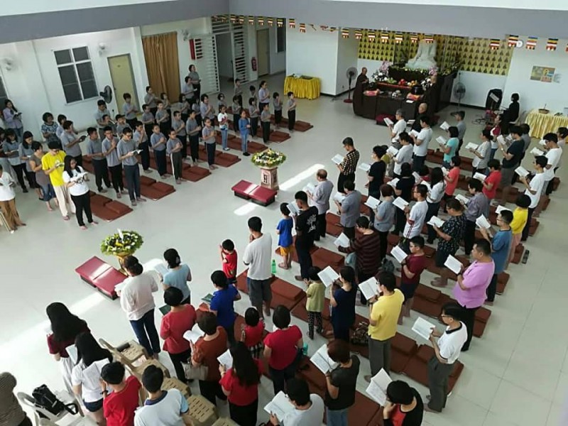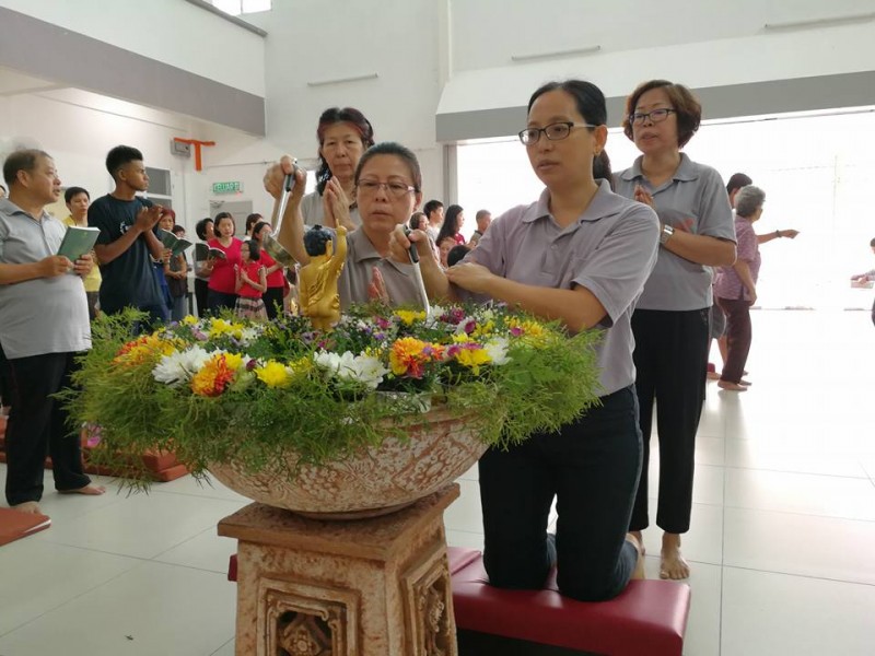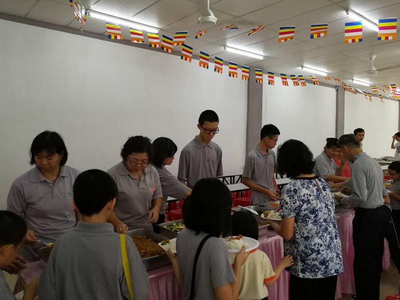 11点20分,浴佛法会圆满结束。随后,在慈悲的真舍法师带领下,禅苑爱心家族及参与者唱诵释迦牟尼佛圣号,拿着各式旗杆及小佛旗绕着祥云净苑前院走一圈。来个大合照后,大众便到斋堂享用由大众供养的美味菜肴及甜点。中午12点半,禅苑爱心家族便乘搭巴士返回大山脚檀香禅苑。