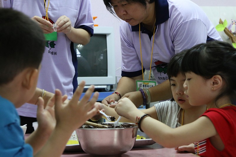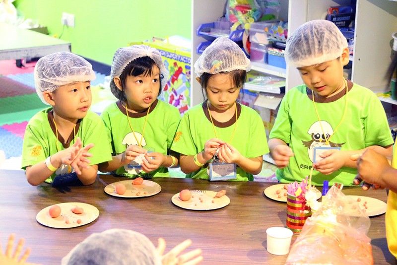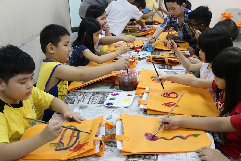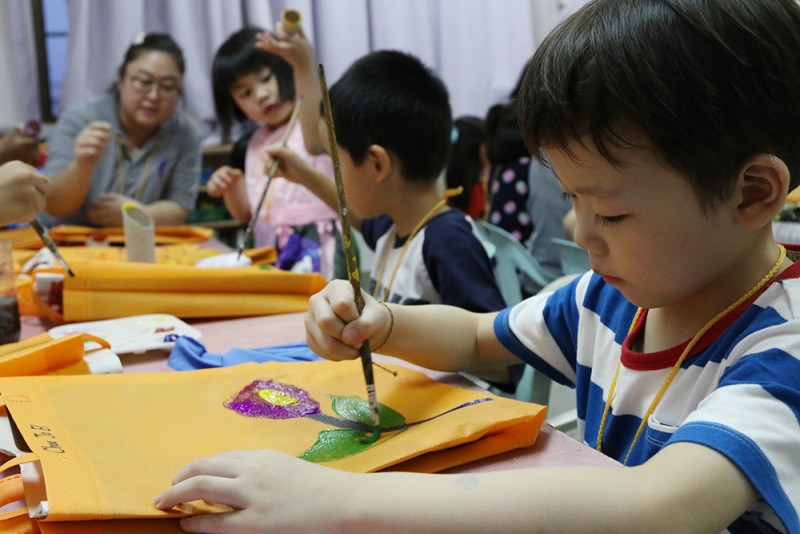 在手工环节中,孩童们学习穿手链,设计环保袋,还有学习制作简单的饼干,并将这些手工、饼干在亲子交流会时亲自送给父母以示感恩。