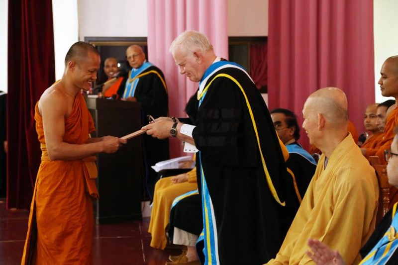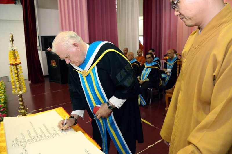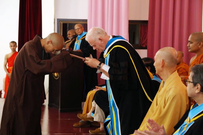 国佛大创办人兼董事会主席释唯悟法师博士与校长魏查理教授博士在典礼上致词后,应届毕业生列队上台领取文凭及证书。接着是资讯工艺/图书馆主任法庆博士代表各科系给毕业生勉励赠言。