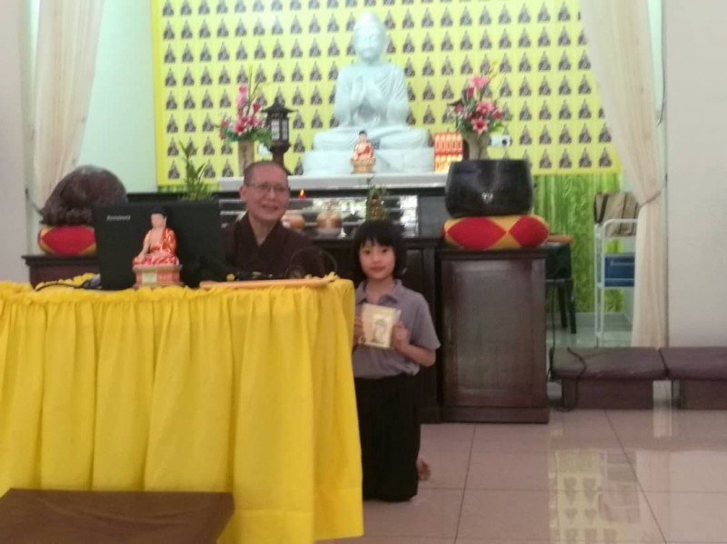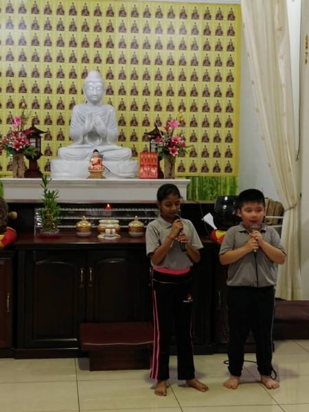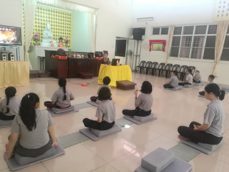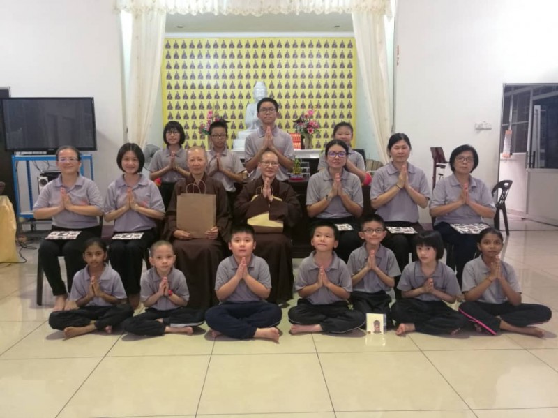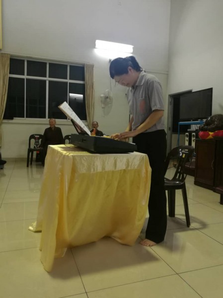 当天下午二时左右,周五佛学班的爱心家族们齐聚净苑佛殿。仪式以唱颂三宝歌掀开序幕,接着锦珊老师带领大众念佛共修,过后便是真信法师为大众慈悲开示。
