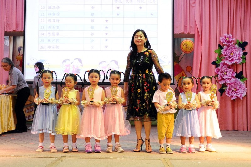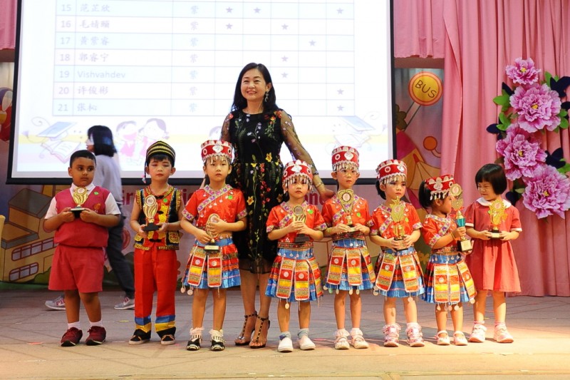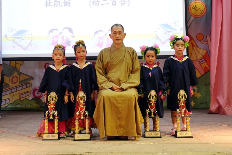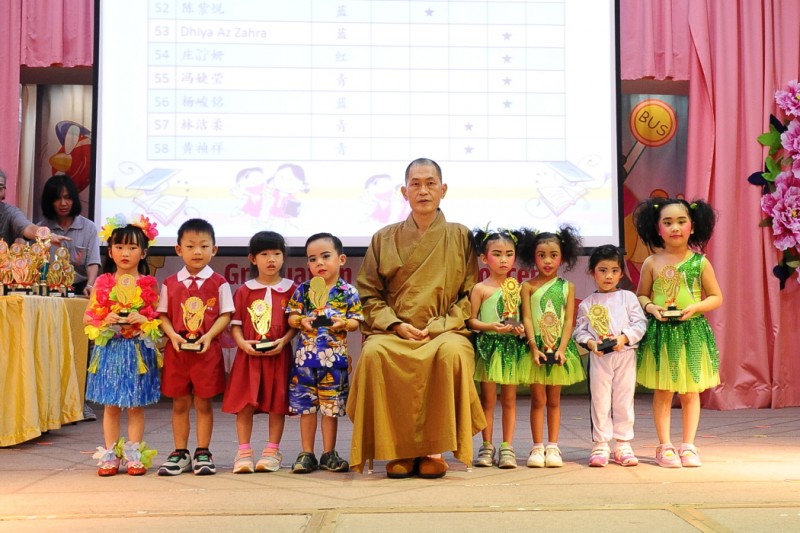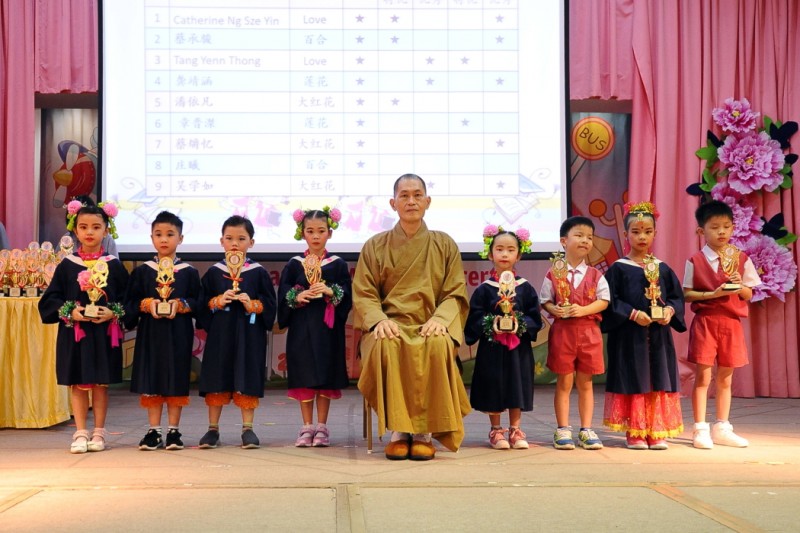 园长致词后便是颁奖环节。由于获奖的小朋友人数众多,园方在台上准备了投影显示小朋友们所获得的奖项名单,以方便观众得知其获奖项目。首先颁发的是最高荣誉奖。最高荣誉奖是颁发予成绩、唱歌比赛及绘画比赛都获得特优奖的小朋友。获得此奖项的小朋友是来自总园的颜睿恩(幼二莲花)、Ng Tze Xin (K2 Love)、叶婧雯(幼二大红花)及杜凯俪(幼二百合)。真如法师为颁奖人并与获得奖项的小朋友合照。接着,师父也颁发了成绩、唱歌及绘画优秀奖予得奖的小朋友们。檀香幼儿园爱心妈妈主任Ivy亦受邀颁发奖项给新港及发林分园获奖的各项比赛优胜者。