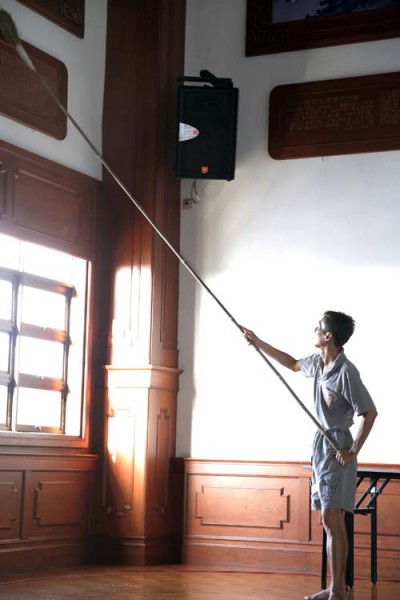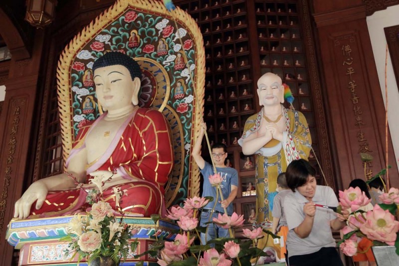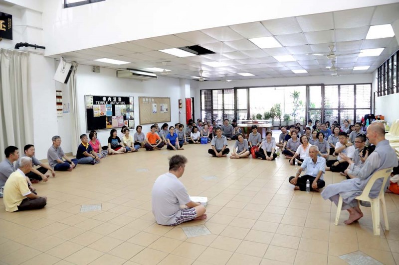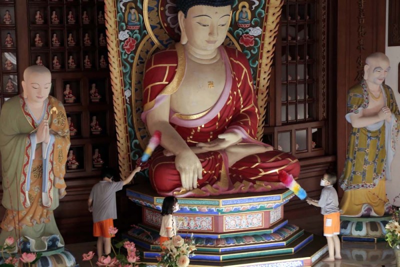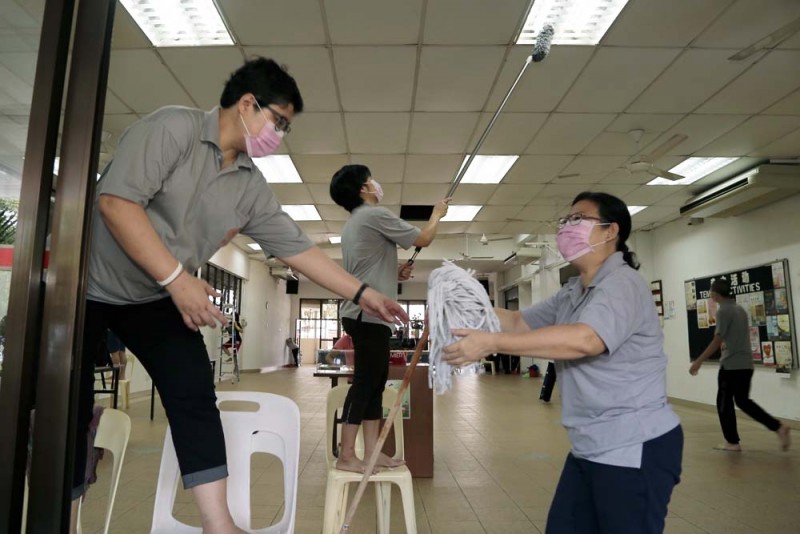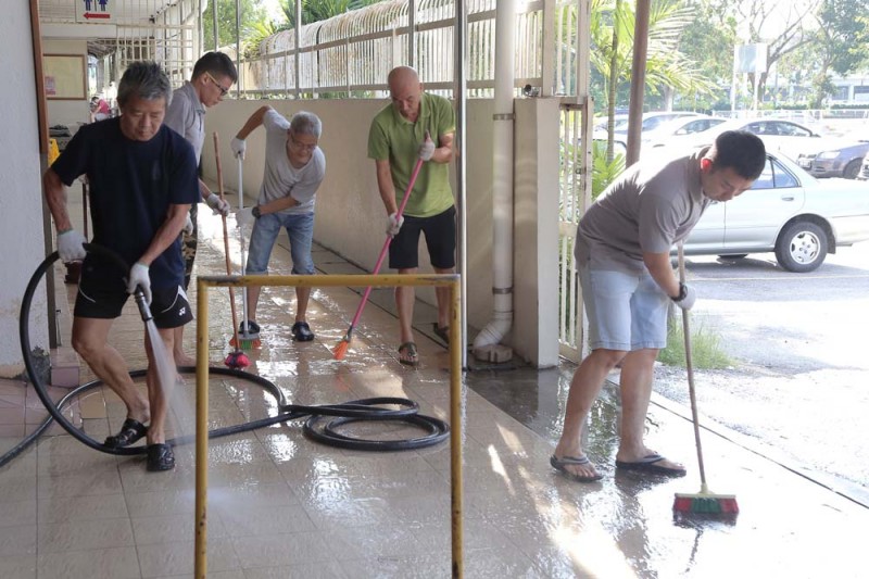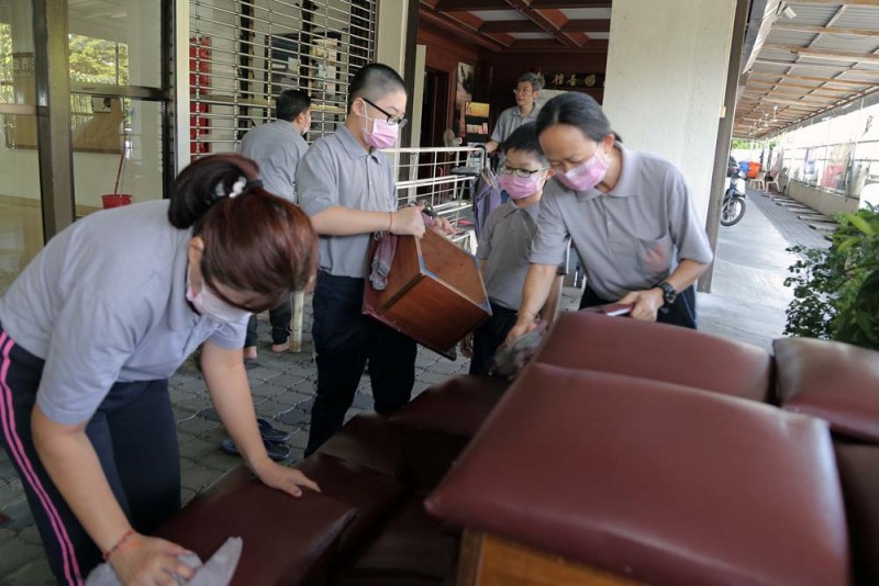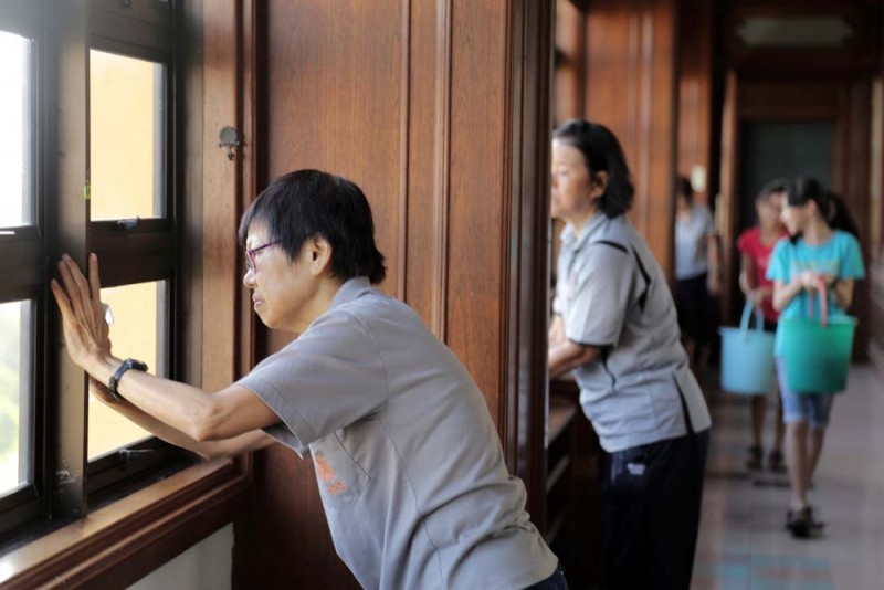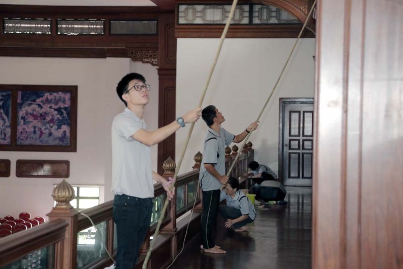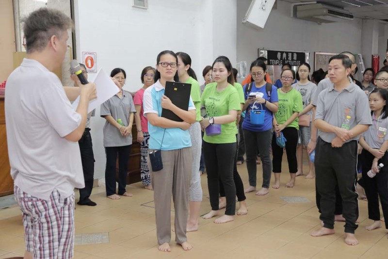 众人先聚集在大悲殿,由Jax林炳添师兄将这约150人分成数个小组,各各分配其负责檀香整栋大楼及周边范围的打扫与清理工作。大伙儿同心协力,扫的扫、抹的抹、冲的冲、洗的洗;间中除了稍歇一会儿,吃些包子充饥之外,都在认真干活。