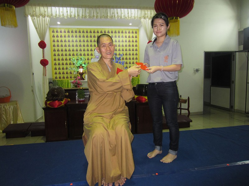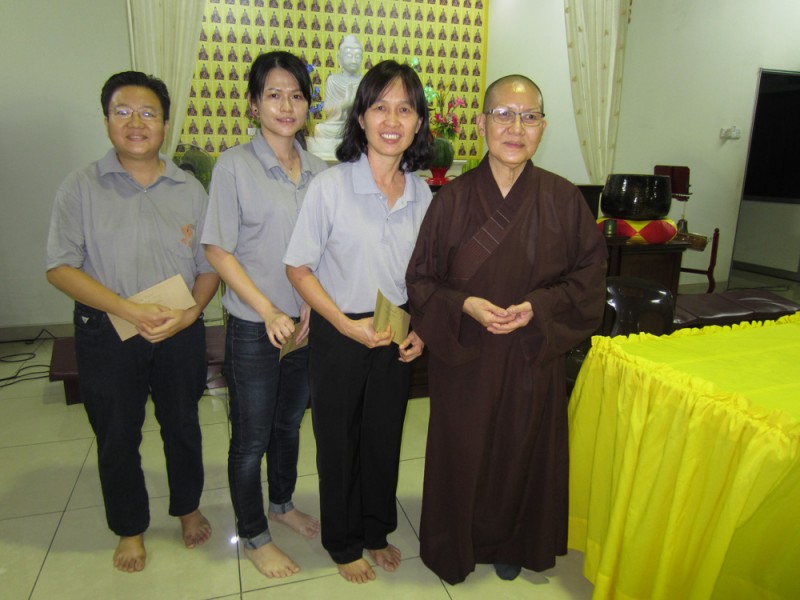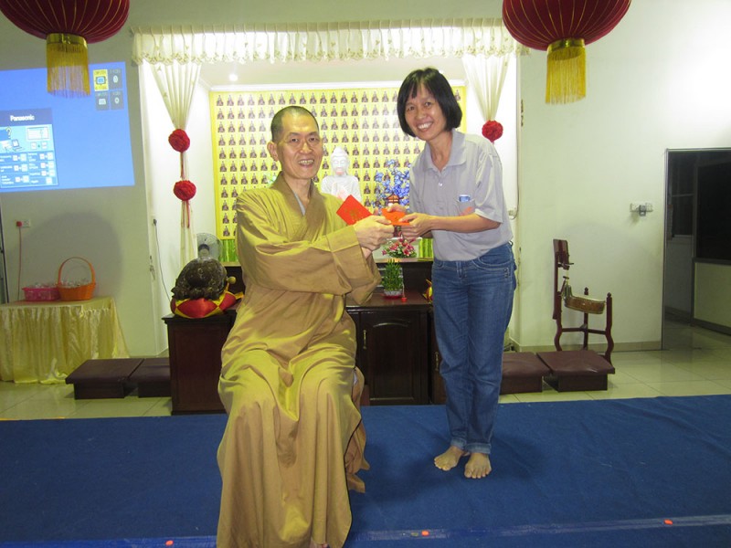 真信法师开示完毕,就颁发职员服务奖予在檀香幼儿园服务12年的吴宝琴老师、服务7年的的陈安仪老师与服务6年的朱彩君护士。得奖者与师父合照后,余兴节目开始了。