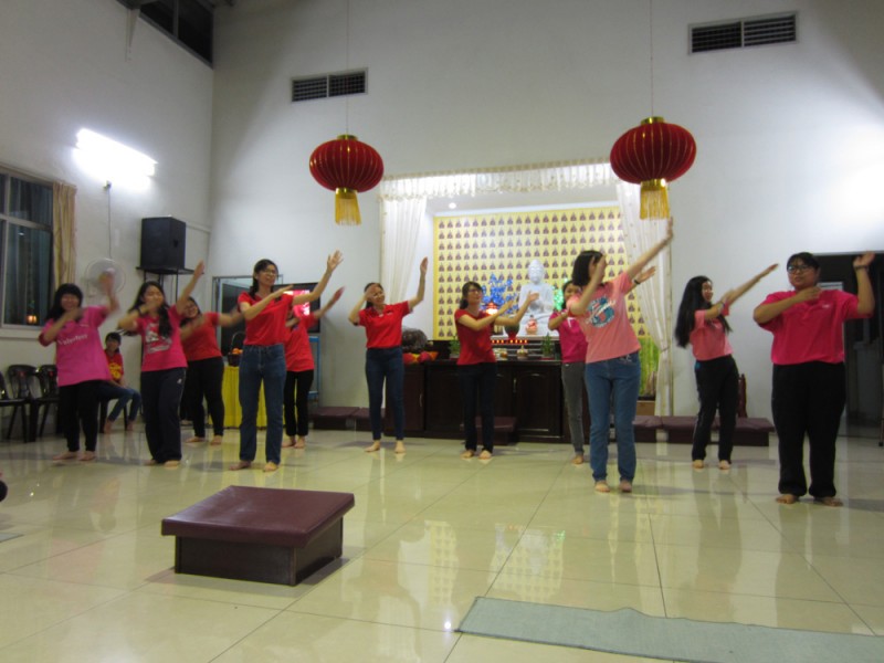 打头阵的是檀香幼儿园小朋友呈现的舞蹈《春晓》,可爱的小朋友们活泼的表演赢得了大家热烈的掌声;接下来,檀香晚晴苑的老菩萨们合唱两首歌曲:《晚晴苑之歌》和《恭喜恭喜》,冯江子老菩萨再独唱《创造》,老菩萨们的表演获得大家的鼓励掌声;接着,檀香佛曲班学员带来三首歌曲——佛曲《点灯的孩子》、新年歌曲《大家恭喜》和《万年红》跟大家拜年,给大家祝福;最后,是苏丹阿都哈林师范学院学员的压轴表演——手语《春天哗啦啦》和绳子小魔术,让欢乐气氛充满整个佛殿。