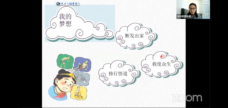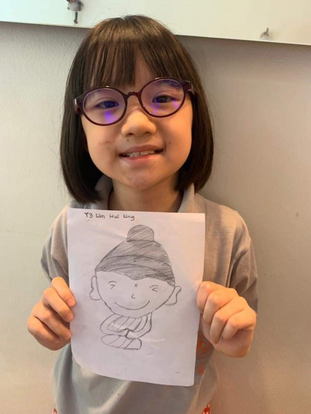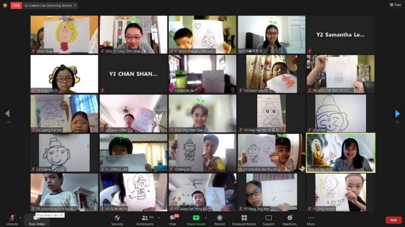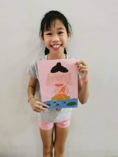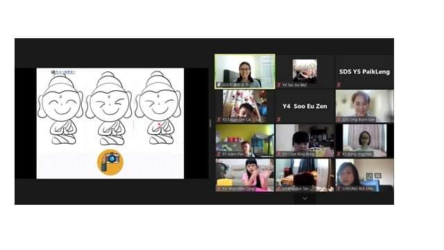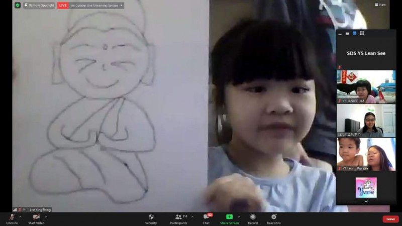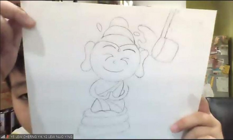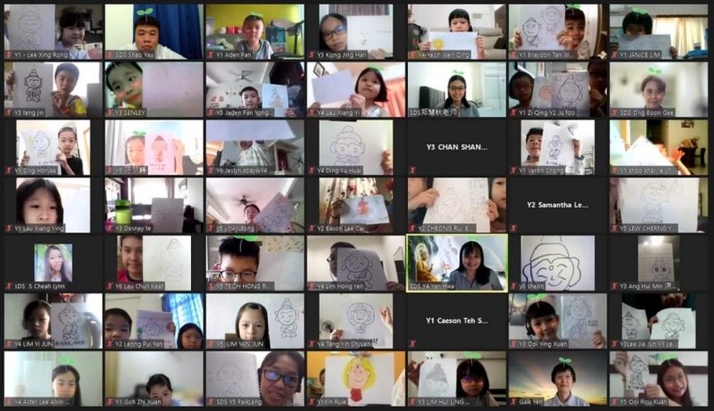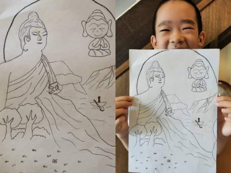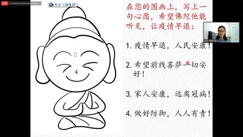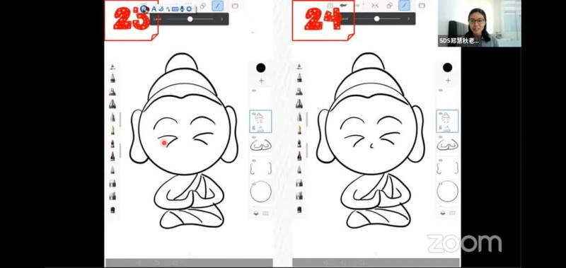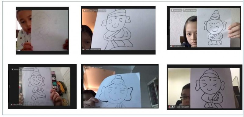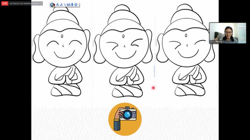 在主持人文仪老师的配合和协助下,慧秋老师教导小菩萨们用26笔线条,快速又简单的绘画佛陀像。在线上可以看到每个小菩萨们都很积极发问参与其中画图,小菩萨们认真的模样和可爱的佛陀画,让老师们心都融化了。