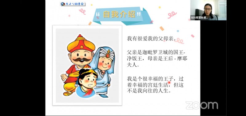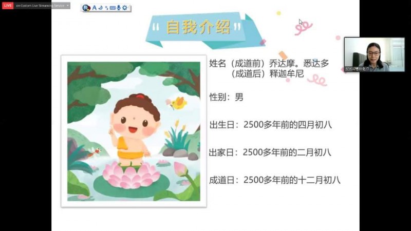 老师以悉达多太子自我叙述的方式,生动活泼地介绍佛陀的出生,悟道及涅槃的历程。