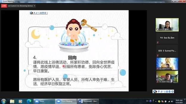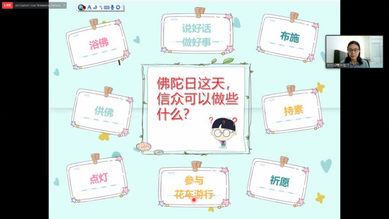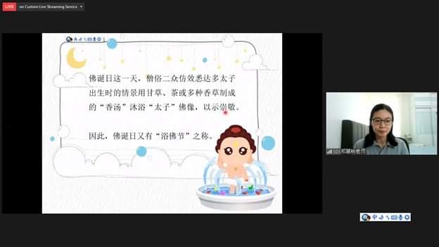 今天我们佛学班慧秋老师用她温柔,细腻的声音为小菩萨们分享讲解这个节日的起源和意义,让小菩萨尝试线上浴佛,供花等等,以及可以在26/5卫塞节当天可以进行的活动和应有的慈悲心态。