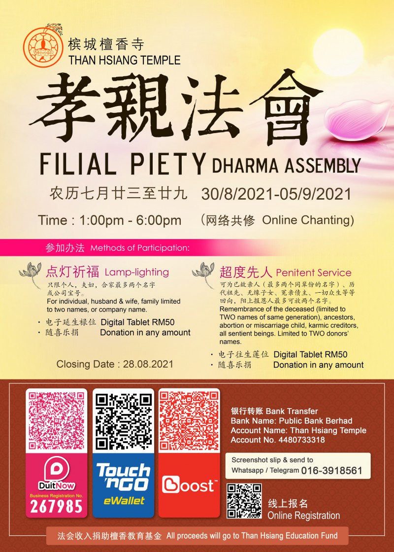 农历七月是华人慎终追远,感恩报恩的日子。本寺为了提倡佛教盂兰盆节,发扬慎终追远及报恩孝亲的美德,订于公元2021年8月30日至9月5日(即农历七月廿三日至廿九日)启建孝亲法会。