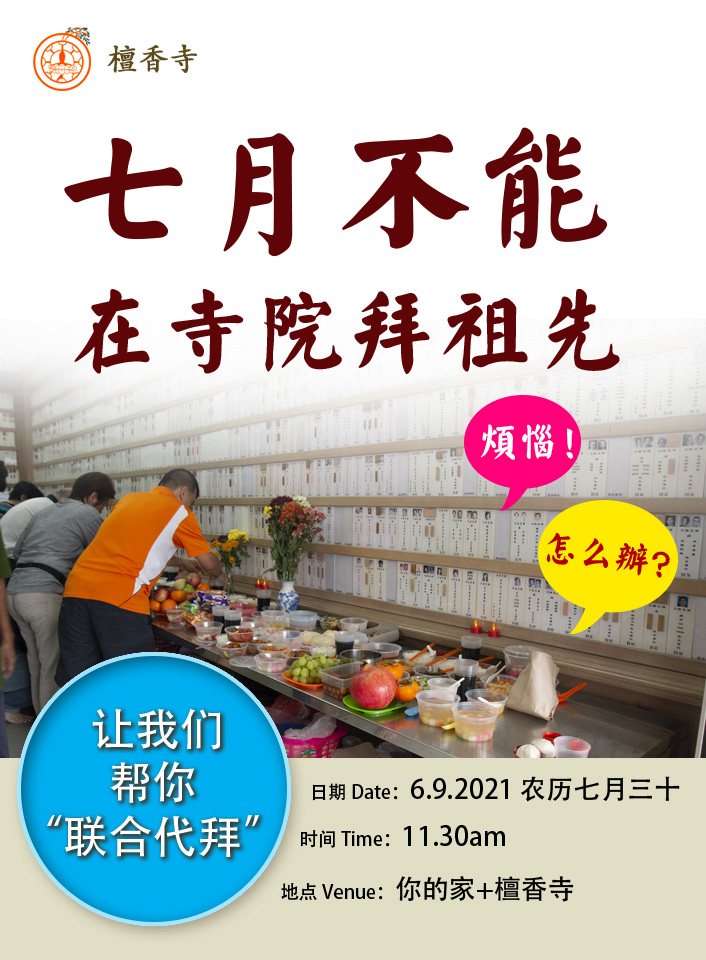 檀香寺为方便孝子贤孙在行动管制下,无法前来寺院尽孝拜祖先,举行【联合代拜】。你们只需呈交要祭拜的亡者名字和您的名字,我们将为大家在地藏菩萨圣诞日(2021年9月6日)上午11时半为大家联合代拜先人,您则只需留守在家,也欢迎跟随现场直播,参与祭拜,同时唯悟法师也将在当天开示代拜的意义。