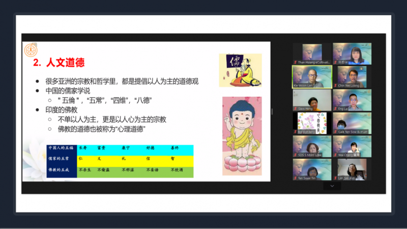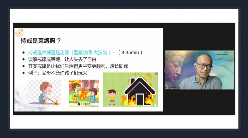 林旂稳居士以浅显易懂的方式带领大家认识佛教的戒或戒律。戒原本就是一种道德学,而道德就是人们共同生活时,个人行为的准则和规范。简单的来说,道德让我们如何分辨善与恶。他进一步解释依着不同的地区和不同的文化背景,我们可以把世界上现有的道德学分别是神权道德与人文道德。
