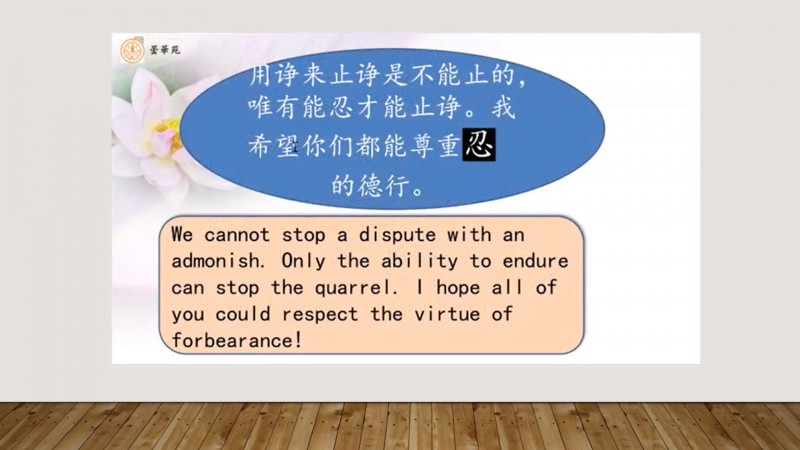 “你们不要诤,用诤来止诤是不能止的;惟有能忍才能止净。我希望你们都要尊重忍的德行。”