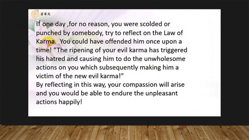 大臣们很悦服,回城进宫以后,梵豫王请长生童子香汤沐浴,以王者的服装为他穿戴,让出自己的宫殿,请长生童子坐在自己的金床之上,最后把自己的女儿许给长生童子为妻,派了很多的军队车马,护送长生童子回国。法师做了总结,如果有一天,你无缘无故被人骂或挨了人家一拳。你要用因果法去观,这不会是无缘无故,一定不知道何年何月你曾经得罪了他。接下来你要这么想:唉,我在冒恶果,我的恶业果报成熟了,但却引发他造恶业,害他起嗔恨心,说了恶言,作了恶行,他也是一名可怜的受害者。能如是观,你的慈悲心就会升起。这样你就会忍下来,是欢喜地忍下来。
