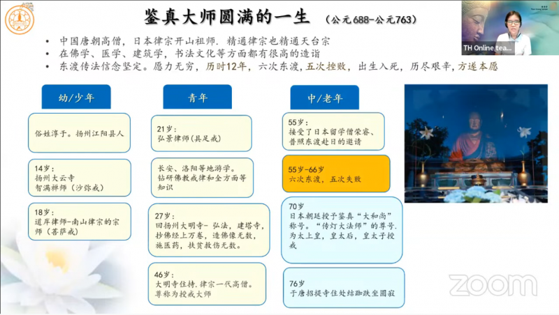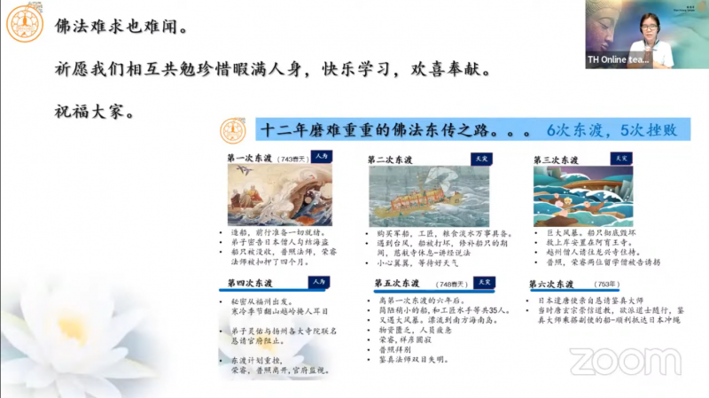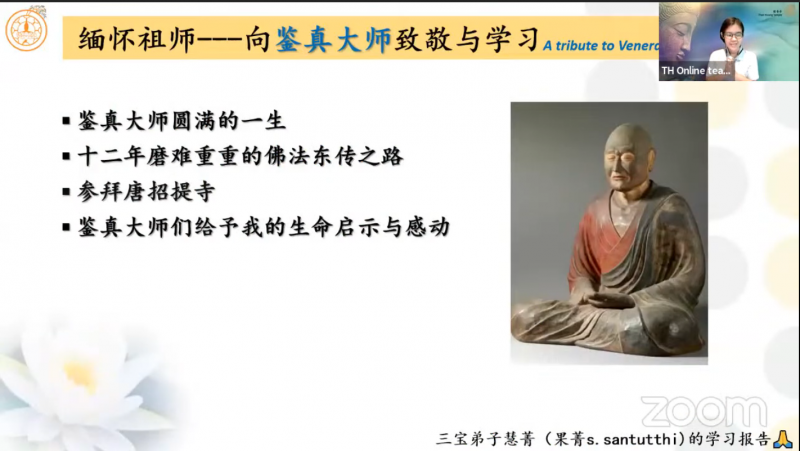 檀香寺在家僧团成员-陈慧菁居士今晚为我们分享有关一位伟大祖师,伟大的一生的故事,主题叫做《缅怀祖师---向鉴真大师致敬与学习》。从慧菁居士今天的分享,我们知道了戒律的重要性。