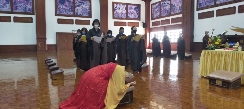 仪轨进行的时候,大家注意引礼法师的指示。戒子在受三皈依和十善法的时候,请念自己的名字。引礼法师也会带领戒子念,先念LAY SANGHA然后念自己的名字。比如慧丽,就称自己LAY SANGHA慧丽。引礼法师说拜,戒子就拜下去,他说起,戒子就起来。当师父问,戒子就回答,跟着戒本上回答。