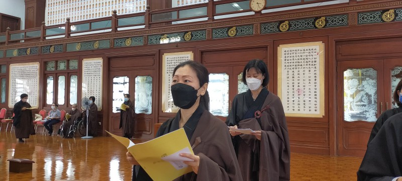 开示完毕,檀香寺开山上唯下悟法师带领成员们发菩萨的「三大誓愿」:「 愿断一切恶、愿修一切善、誓度一切众生 」。在诚心「 忏悔」之后,法师为成员 们 传授「三归」、「三结」,然后再传授「十善戒法」给成员们 。上唯下悟法师接着以一个简单的仪式:颁发各成员的巴利文法名,并将缦衣授受给25位成员们 披上,象征他们正式成为檀香寺「在家僧团」的成员。最后,四众弟子同发四弘誓愿、念佛和回向功德。整个授戒及成立「在家僧团」的仪式,授戒及成立「在家僧团」的仪式圆满举行。祝福大家福慧双修!