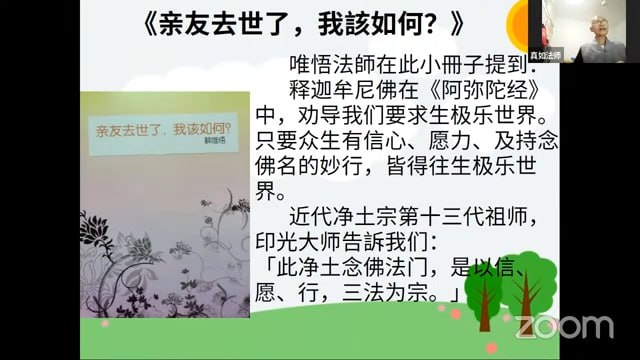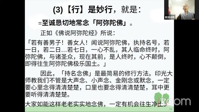 真如法师勉励大众,說:「投下勤力耕耘的『因』,必然能获丰盛收获的『果』」。真如法师开示「持名念佛」是最简易的修行方法,「心里要念得清清楚楚,口里也要念得清清楚楚,耳中更要听得清清楚楚,一定要老老实实地念佛。」