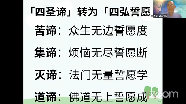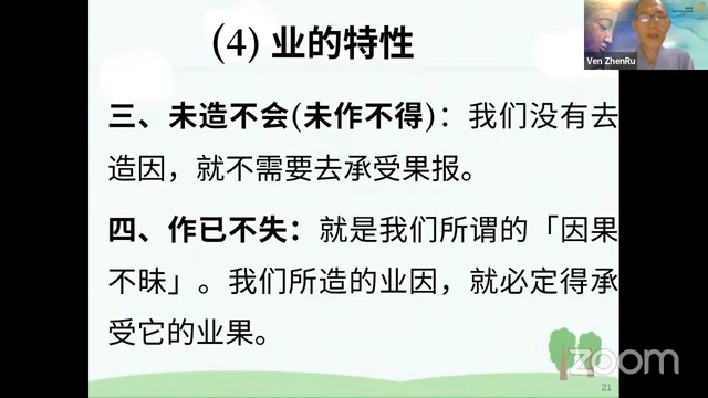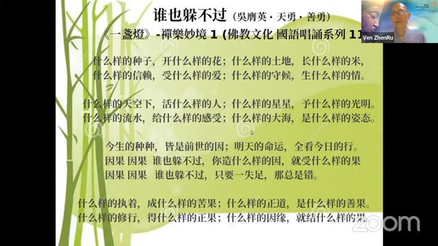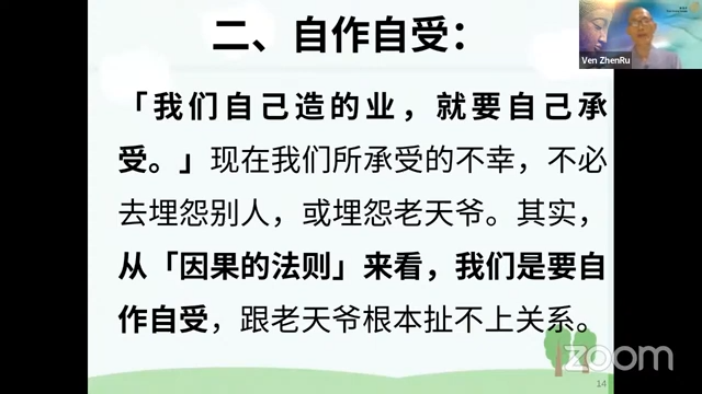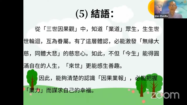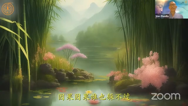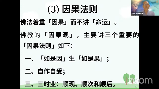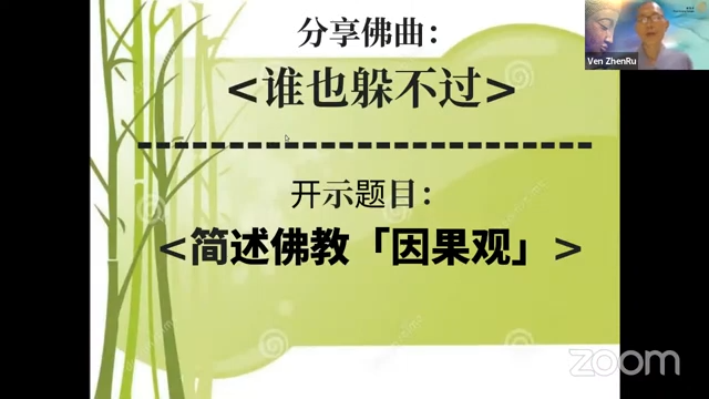 真如法师首先分享佛曲〈谁也躲不过〉,之后讲述「四圣谛」所讲的因果观有「世间因果」及「出世间因果」。真如法师并讲解佛教的因果法则以及业的特性,并分享《了凡四训》典故,最后真如法师勉励大众:「欲知前世因,今生受者是;欲知來世果,今生作者是」。