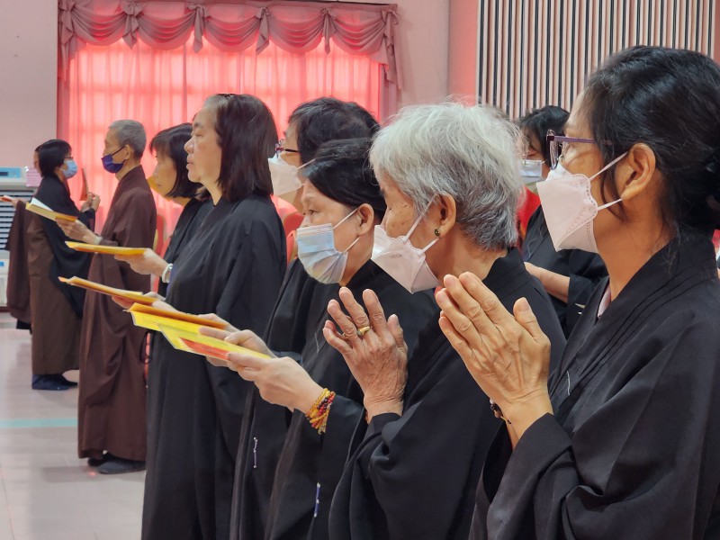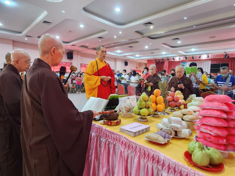 参加法会的善信们在义工的带领下入座,现场人潮接近5百人。有人搭海青披曼衣,有人随喜参加。法会当天恭请真如法师担任主法和尚,大众诚心跟着和尚法师一起恭诵经典并随文观想。第一时佛事结束之后,和尚为大众慈悲开示孝亲法会的意义,以及开示《三时系念》为〈净土宗〉念佛法门之一,是生亡两利的佛事,主要规劝生者念佛以及劝导亡者依弥陀之大愿往生西方极乐世界。
