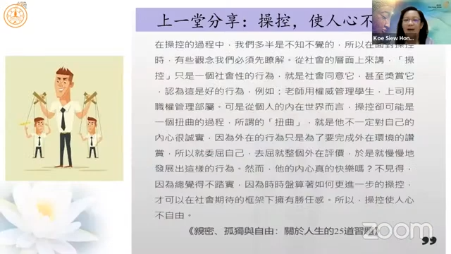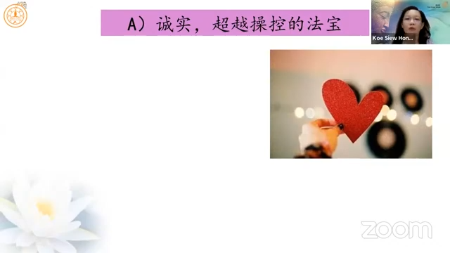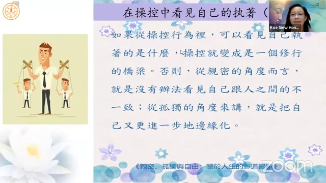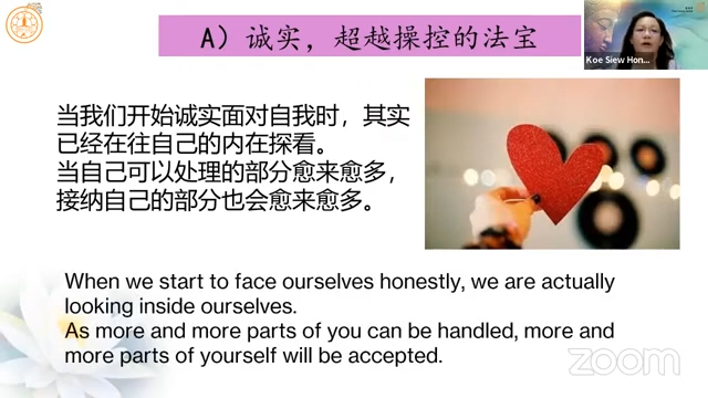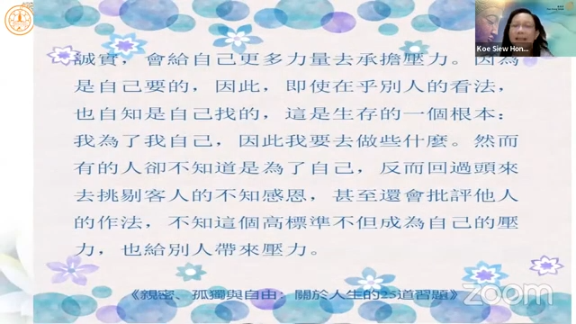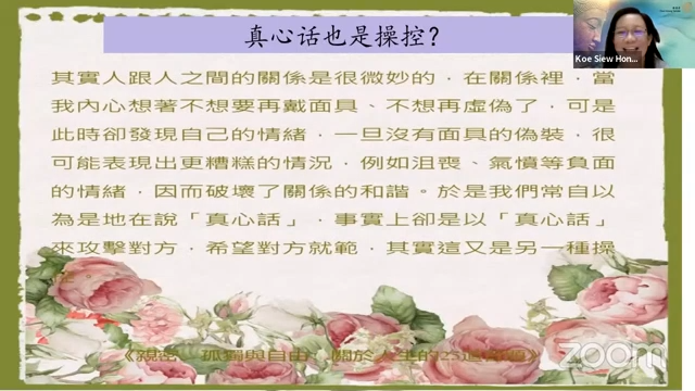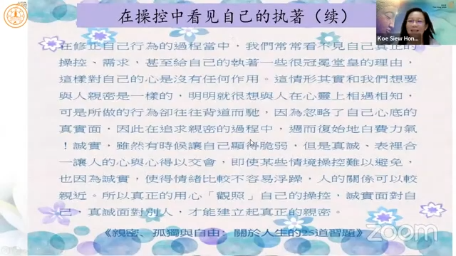 高秀凤居士延续上次分享的「亲密与操控」,引用杨蓓教授《亲密、孤独与自由》提到,「诚实是超越操控的法宝」,当我们开始诚实面对自己时,其实是往自己的内在探看,当自己可以处理的部分愈多,接纳自己的部分也会愈来愈多。诚实地去面对自己的要求,才不会将要求加诸在别人身上,也不会以为是为别人而做而因此回去批评他人不懂感恩。