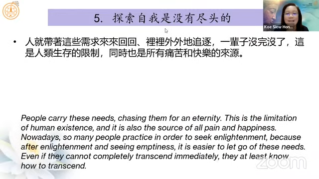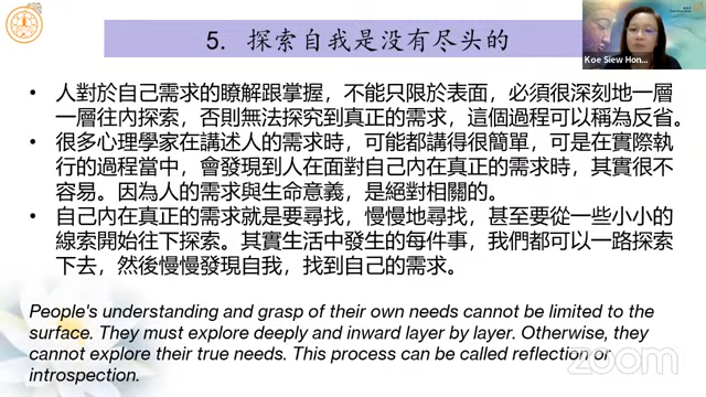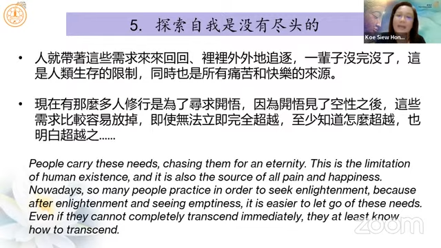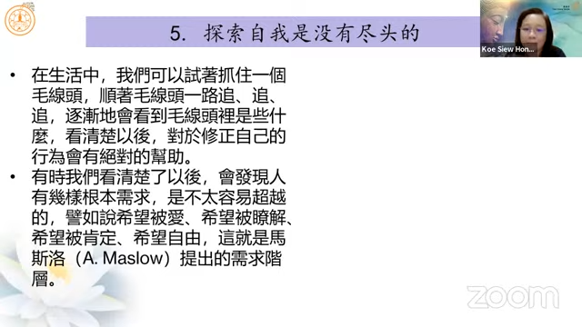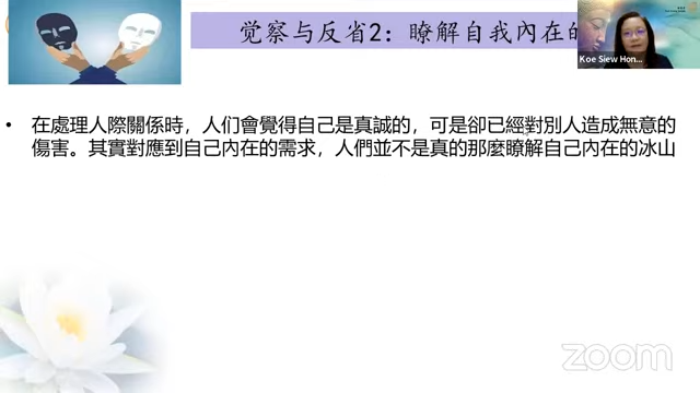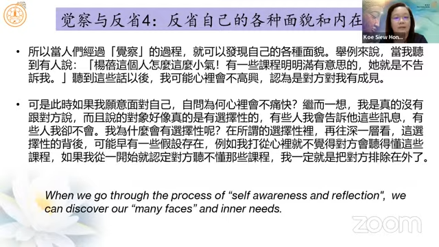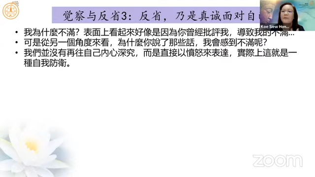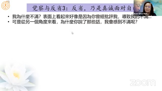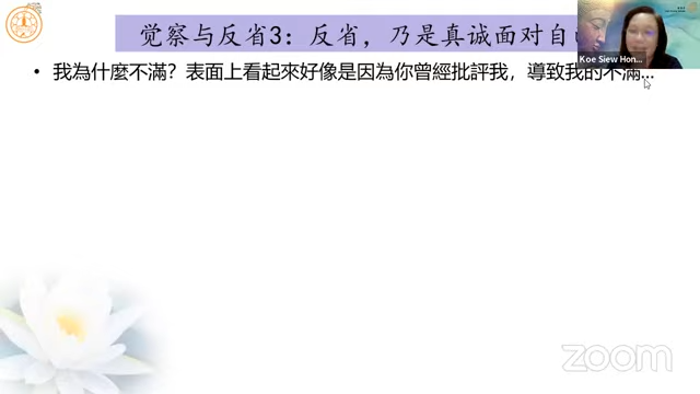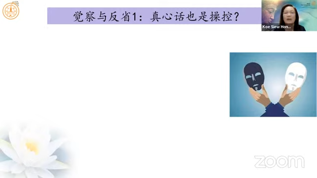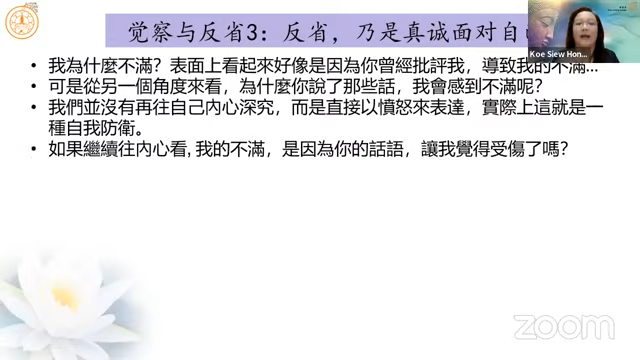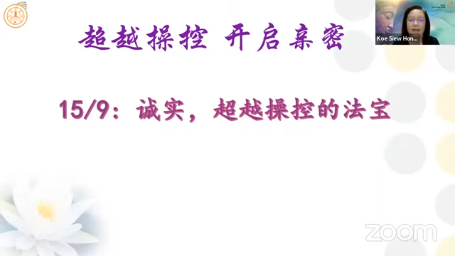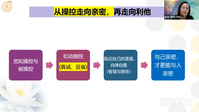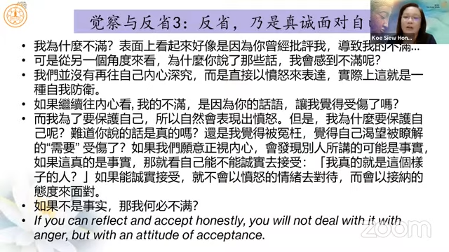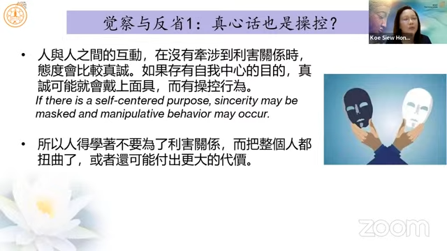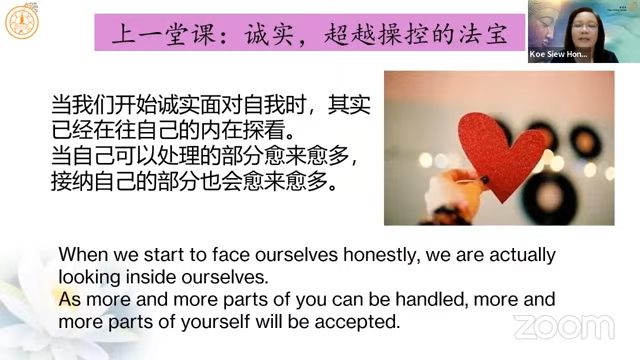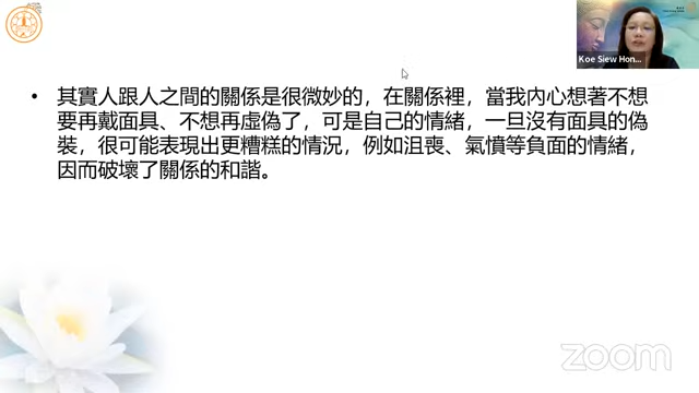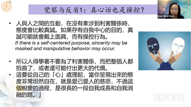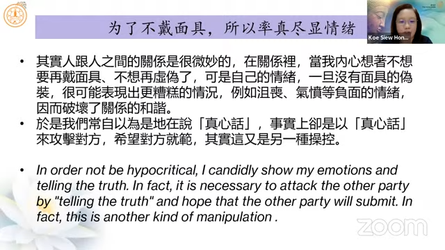 高秀凤居士延续上次分享的「诚实是超越操控的法宝」,引用杨蓓教授的著作《亲密、孤独与自由》提到「反省是开启亲密的契机」,认为每一个人都得学着不要为了利害关系,而把整个人都扭曲了,或者还可能付出更大的代价!这要从自己的「心」处理起,当你呈现出来的态度非常坦然自在,就是爱己爱人的慈悲!