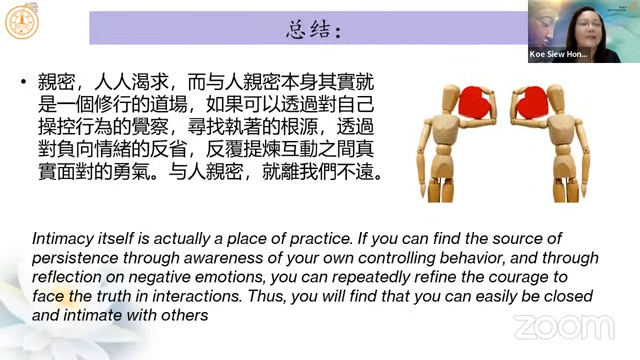 最后,高秀凤居士强调,每个人如果可以透过对自己操控行为的觉察,寻找执着的根源,透过对负向情绪的反省,反复提炼互动之间真实面对的勇气,那么,与人亲密,就离我们不远了!