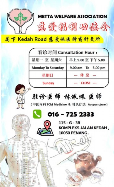 慈爱施医赠药针灸所慈爱福利功德会 属下 槟城吉打律慈爱施医赠药针灸所 看诊时间: 星期一至星期六 早上 9 点 至下午 5 点 星期日:休息 驻诊医师 林佩佩医师 (中医内科 & 针灸疗法 ) 联络电话:016-725 2333 地址:115-G-3B,KOMPLEKS JALAN KEDAH, 10050 PENANG. Log in to post comments2480 reads