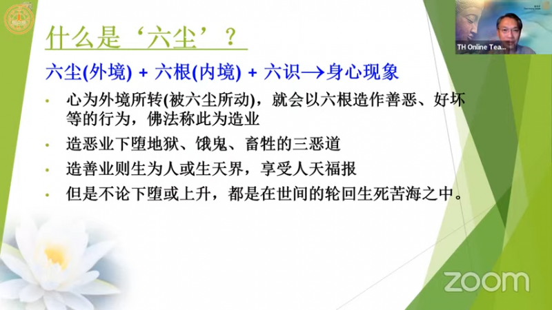 六根在接触外境之后会产生身心现象,如果这个时候,心为外境所转,也就是被六尘所动,就会造作善恶、好坏等行为,也就是佛教所说的「造业」;若身心处于六尘世间,而不为六尘世间所困扰、诱惑,而能明白到六尘是虚幻不实的、多变的,就不会为六尘世间所困扰而起烦恼,当下就是解脱之人!