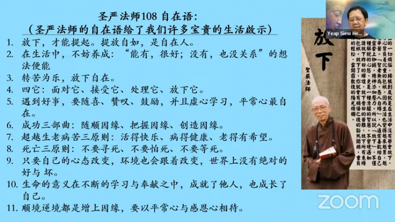 圣严法师的《108 自在语》:「 放下,才能提起!提放自如,是自在人!心态改变,环境也会跟着改变。生命的意义在不断的学习与奉献之中,成就了他人,也成长了自己」!