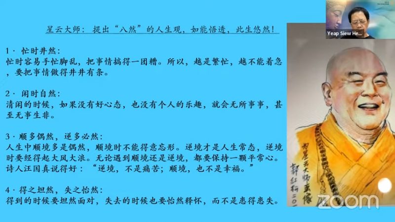 星云大师的「八然」人生观: 「忙时井然,闲时自然;顺多偶然,逆多必然;得之坦然,失之怡然」,如能悟透以上「八然」,此生悠然!