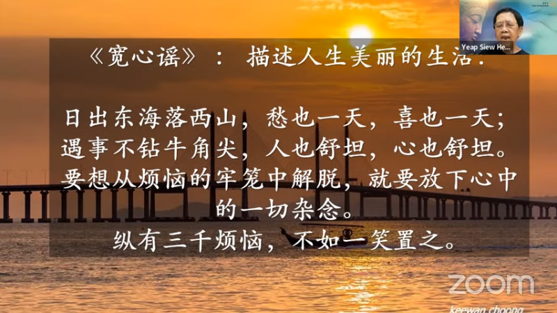 叶秀欣居士分享三个小故事以及《宽心谣》中所说的:「日出东海落西山,愁也一天,喜也一天;遇事不钻牛角尖,人也舒坦,心也舒坦」。