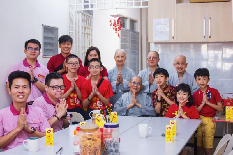 开示圆满结束后,师父引领众人回向,祈愿大家新的一年身心愉悦、福慧增长、法喜充满。之后众人去大精舍向女众僧团拜年。大家也没忘记去探访晚晴苑的老菩萨。接着一行人顺序前往十一家家庭拜年送果仪, 分发经书、唱诵、说祝贺语并合照。