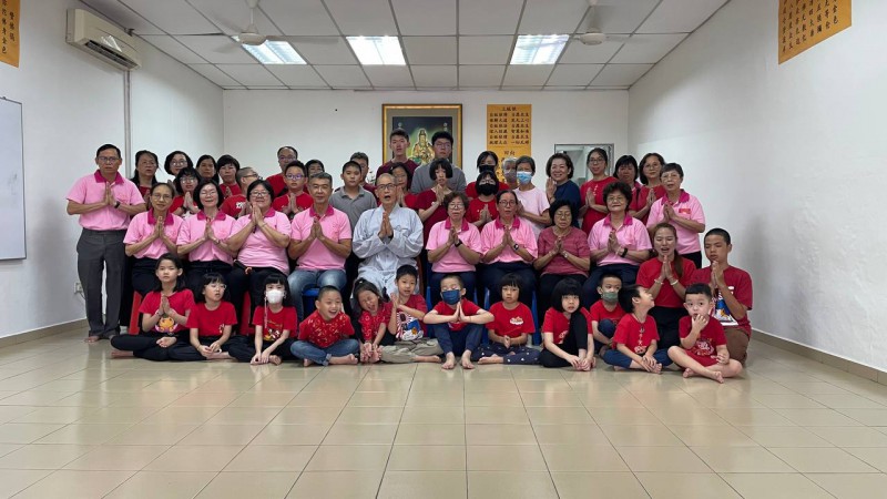 团拜活动于上午9时30分,在司仪坤艾老师的带领下,正式开始。真如法师为中尊,两位青年菩萨(政羲与睿恒)分别司职引磬和木鱼,协助法师带领大众进行早课,一起诵经共修。除了唱诵早课经文,学生们和大众也一同念诵《福智十善法》和《檀香四大信念》。看见小菩萨和青年菩萨能够朗朗上口,流利的唱诵,心里涌现了一股暖流,那是一种惊喜和感动。