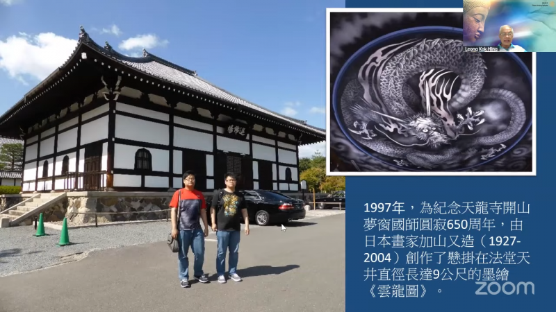1997 年,为纪念天龙寺开山「梦窗国师」圆寂 650 周年,由日本画家加山又造 ( 1927- 2004 ) 创作了悬挂在法堂天井直径长达 9 公尺的墨绘《云龙图》。