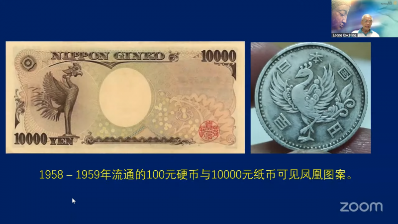 1958 - 1959年流通的日本100元硬币与一万元的纸币可见凤凰图案。