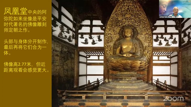 假如我们有读过《观无量寿经》,经文内容叙述:「若欲至心生西方者,先当观於一丈六像,在池水上」。所以,「凤凰堂」和其周围的净土式庭园,是根据《观无量寿经》所形容的景象而打造出来。