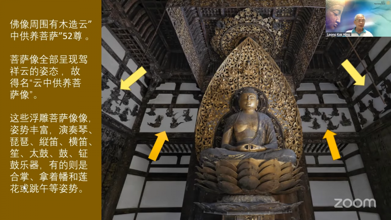 佛像周围有木造「云中供养菩萨」52 尊,菩萨像全部呈现驾祥云的姿态,故得名「云中供养菩萨像」。这些浮雕菩萨像,姿势丰富,演奏琴、 琵琶、縱笛、横笛、 笙、太鼓、鼓、钲鼓乐器,有的则是合掌、拿着幡和莲花或跳舞等姿势。
