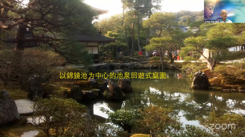 银阁寺内有一座观音殿,前方有一个以「锦镜池」为中心的池泉回遊式庭園。
