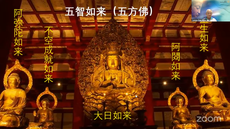 五方佛:阿弥陀如来﹑不空成就如来﹑大日如来﹑阿閦如来﹑宝生如来。