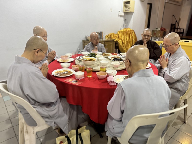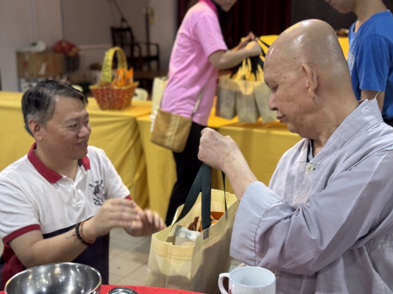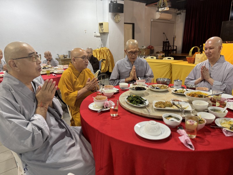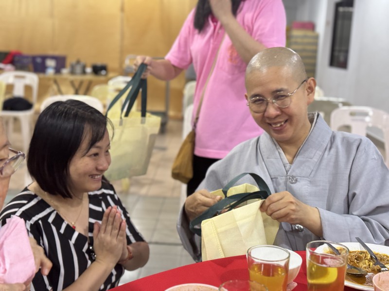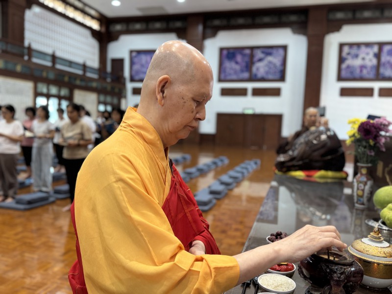 开示圆满结束后,盂兰盆法会诵经仪式至此圆满。檀香寺开山唯悟法师与诸位法师移步到底层楼小礼堂接受应供,善男信女也借此佛欢喜日殊胜之日,欢喜供僧,广植福田。