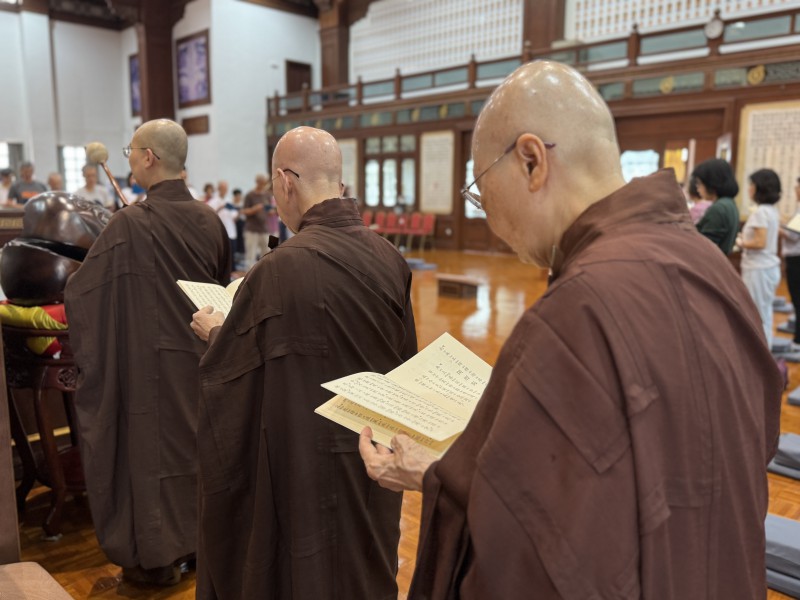 上午十时三十分,檀香寺开山唯悟法师偕同诸位法师,引领大众恭诵《佛说盂兰盆经》。因适逢周六,信众陆续前来参与诵经,共沐法喜。诵经仪式圆满后,法师们继续带领大众进行佛前大供仪式,随后法师们移步至延生坛与三圣殿,做回向。