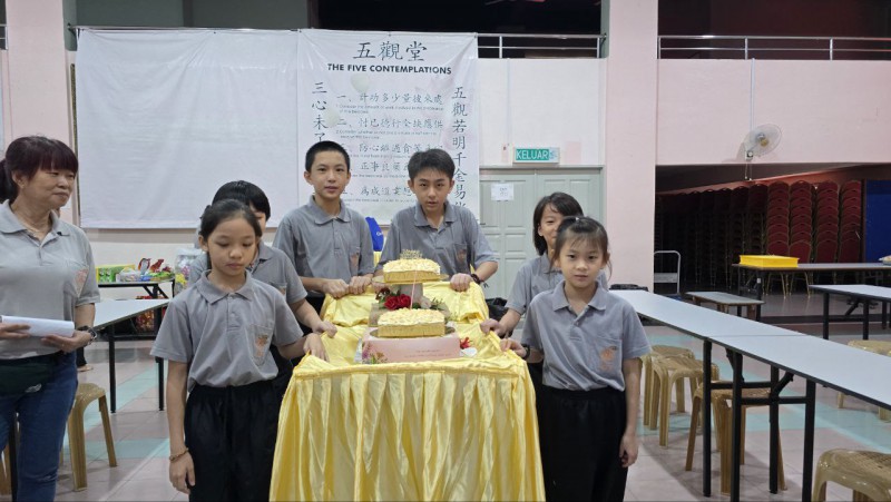 早课完毕,接着是庆生环节。小菩萨代表们缓缓推出精美的生日蛋糕。在司仪的引领下,全体齐声唱诵佛化生日歌,以清净善美的音声,共同为七月至十二月出生的小菩萨们献上真挚的祝福。唱完生日歌后,寿星们闭目合掌,在摇曳的烛光前虔诚许愿。随后,寿星们共同切开蛋糕。