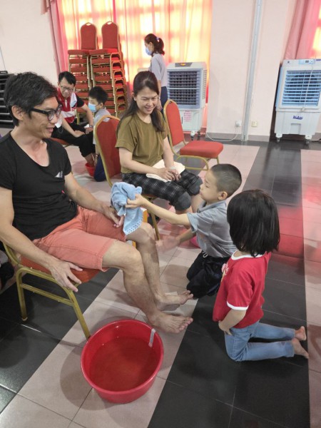 接着是亲子互动项目。这次的活动以 “温暖双足·幸福同行” 为主题。首先进行的是泡脚环节,小菩萨们为父母准备好温水,轻轻为他们洗脚。泡脚不仅能促进血液循环、放松身心、改善睡眠,更重要的是,它成为了一种表达爱与感恩的方式。孝顺从不需要华丽的言语,一个简单的举动,就能让父母感受到孩子最真挚的爱意。