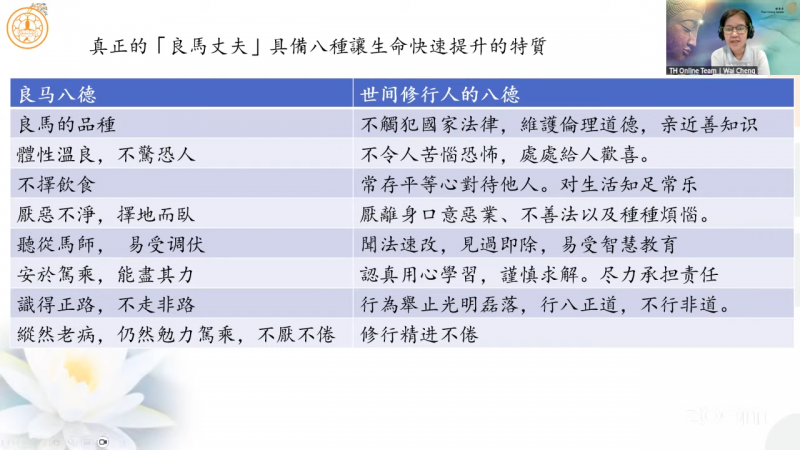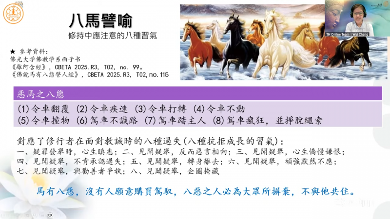 继 1 月 30 日,陈慧菁居士分享「四马喻」 https://thanhsiang.org/ch/node/6843 之后,今天,陈慧菁居士继续与大家谈谈「八马譬喻」。