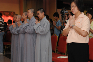 最后,大会礼请真信法师主持传灯仪式。在法师的带领下,一盏一盏电子灯随着音乐轻轻摇摆。大家手上的电子灯象征着漂泊在恒河上的无尽灯,随着电子灯燃亮,代表佛法流传不息;希望每一盏灯普照大地,把真善美的种子传播下去,照亮黑暗。