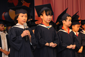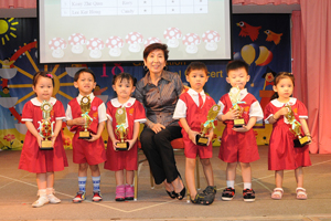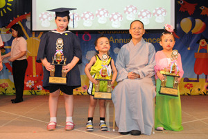 致词完毕后,即由释真信法师、爱心妈妈主任钟美娥居士、檀香幼儿园总园园长陈矜连老师颁奖予最高荣誉奖及三、四、五、六岁各组的成绩优秀奖、歌唱比赛优秀奖以及填色及绘画优秀奖。本年度荣获最高荣誉奖的小朋友是:潘芷甜、Teh Yao Le、Cheang Yan Teng。接着由总园园长陈矜连老师颁发毕业证书予毕业生代表郑锦杰同学。最后,由毕业生代表钟耀聪以国语致词、王雯靖以华语致词及钟家庆以英语致词。