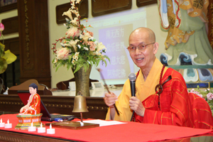 念佛倒数迎新年于晚上10时30分正式开始,各方佛友带着愉悦的心情聚集在在大雄殿内准备开始念佛倒数迎新年。首先,由檀香寺住持唯悟法师向各位佛友们慈悲开示佛法。紧接下来即进行念佛及倒数活动。