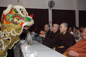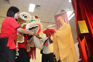 当天,由菩提国中武术团学生为大众呈现祥狮献瑞。同学们舞狮英姿非凡、鼓声震天,让人感受到祥狮的威武。檀香寺住持唯悟法师在会上为大众慈悲开示。师父表示2010年是菩提建校至今第70周年,菩提学校前身是菩提学院。今天大家欢聚在菩提中学是一种缘分,因此,唯悟法师与大家分享菩提学院的创办人——芳莲法师。