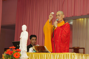 真如法师提醒大众不要排斥世间习俗,他还提出三个观点供大家参考:(一)要以尊重的心,教育自他;(二)以佛法注入正知见于民间习俗;(三)七月不是鬼月,而是吉祥洋溢的孝月。行孝要及时,父母就是家里的活菩萨。身为子女者要让父母衣食无忧,长寿延年;更要制造机缘,让父母学佛,使他们对生死有明确的观念和方向。除此,更应该与父母一起精进学佛,转迷为悟,不再轮迴生死。