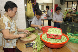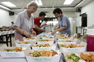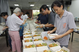 九月素食推广周里,檀香寺除了设有随缘乐捐经济饭、自由餐、各熟食小档还有爱心饭盒外卖。在这九天的素食周里,获得义工们的鼎力支持及帮忙,才得以圆满举行。每天早上,各位义工准时抵达檀香寺准备应付排山倒海似的爱心饭盒外买订单。除此,大家还帮忙中午时段的素食自由餐。义工们一些负责切菜、洗碗、下厨、收拾餐桌等等。