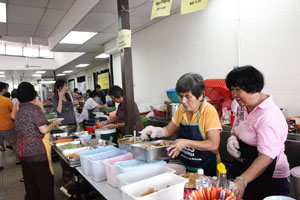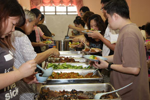 在这素食周里,许多人前来檀香寺享用早餐、午餐以及晚餐,斋堂里工作的职工及义工们都忙得不亦乐乎的。午餐时间,人潮更是把檀香寺挤得水泄不通,很多工厂的职员们都会前来享用午餐。檀香寺斋堂以及五楼礼堂的素食自由餐都看见人潮汹涌,各位职工及义工们都忙着把最好的食物以最佳服务态度献给前来檀香寺用餐的大众们。